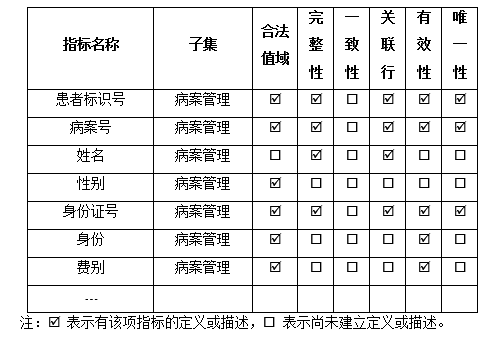 数据质量监控指标由数据项目和质量属性两个部分组成,或表示为:医院信息系统数据元(data element)+质量属性(quality attribute)。
